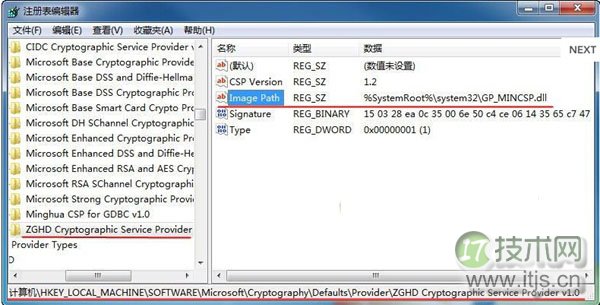农行:HKEY_LOCAL_MACHINE/SOFTWARE/Microsoft/Cryptography/Defaults/Provider/ZGHD Cryptographic Service Provider v1.0,修改Image Path的值为:%SystemRoot%/System32/GP_MINCSP.dll