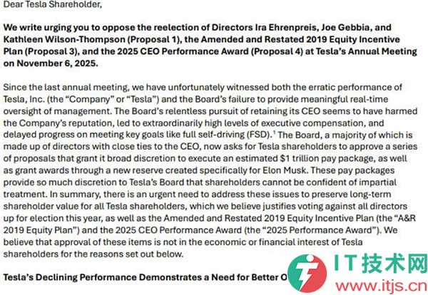 根据投资者团体的信函,特斯拉业绩在过去几年出现下滑,销售与利润下降,股价波动剧烈。团体指出,特斯拉在电动车市场上逐渐落后于竞争对手,在马斯克宣称公司将领先的机器人和无人驾驶出租车领域,也尚未展现出优势。