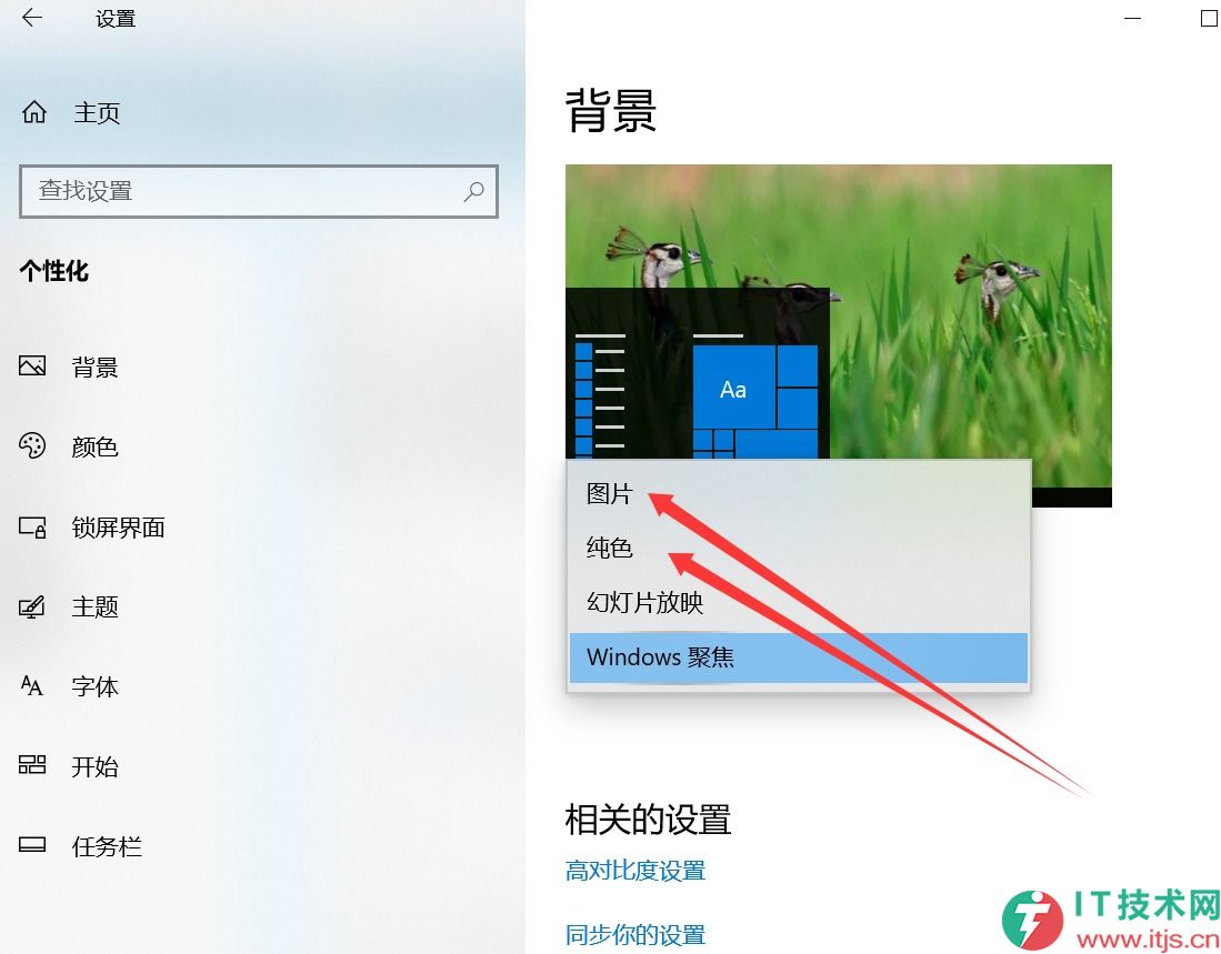 在个性化设置中找到“背景”选项。看到当前是选中了Windows聚焦,那么我们改为选择除了“Windows 聚焦”之外的其他背景类型,例如“图片”、“幻灯片放映”或“纯色”。
