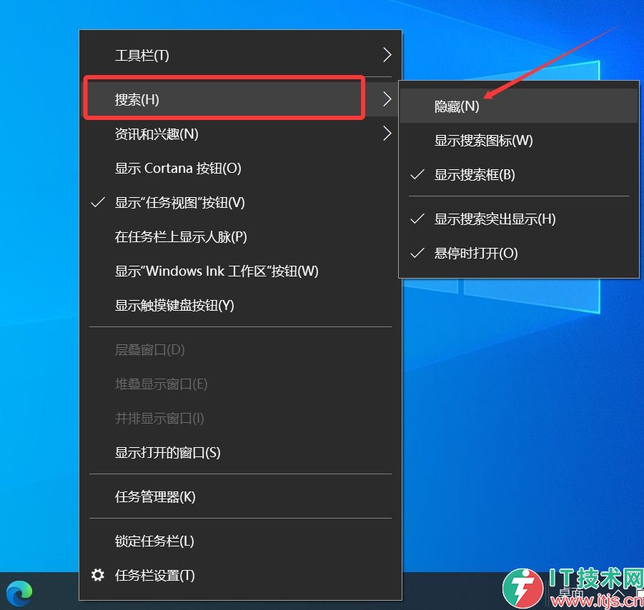 分享 Windows 10系统的新用户会发现,电脑屏幕左下角有一个比较显眼的系统默认搜索框,有人觉得这样很方便,有人则觉得比较碍眼。 ITJS小编就是后者,那么如何将Windows10 左下角的搜索怎么关闭? 1、在底部任务栏的空白处点击右键,弹出界面中选择“搜索”,然后选择“隐藏” 2、这样就会将该搜索框隐藏咯。 本方法经ITJS实测可用。 上一篇 Windows 10使用指南 下一篇