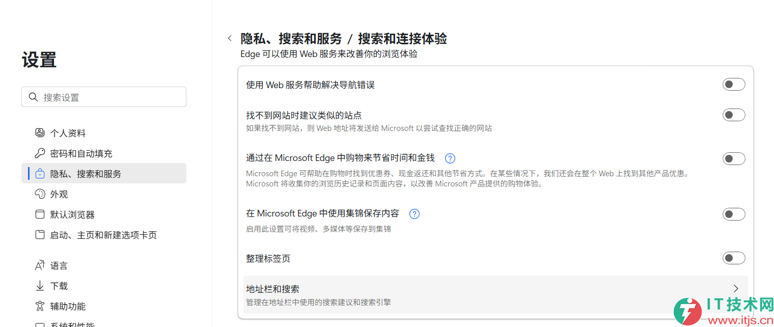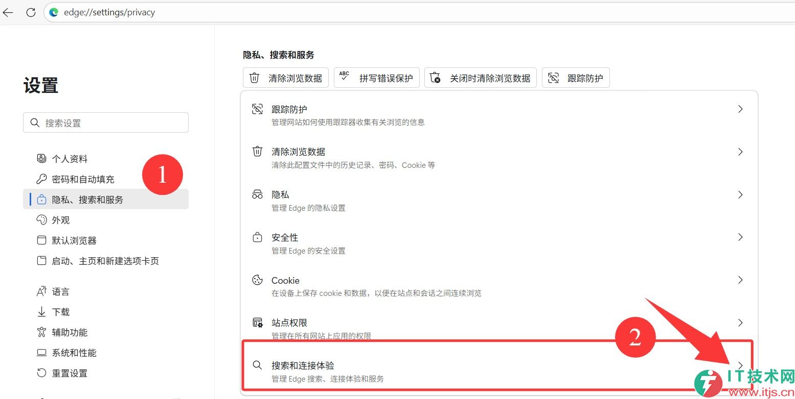 2、在设置界面里,选择“隐私、搜索和服务”,进入“搜索和连接体验”: