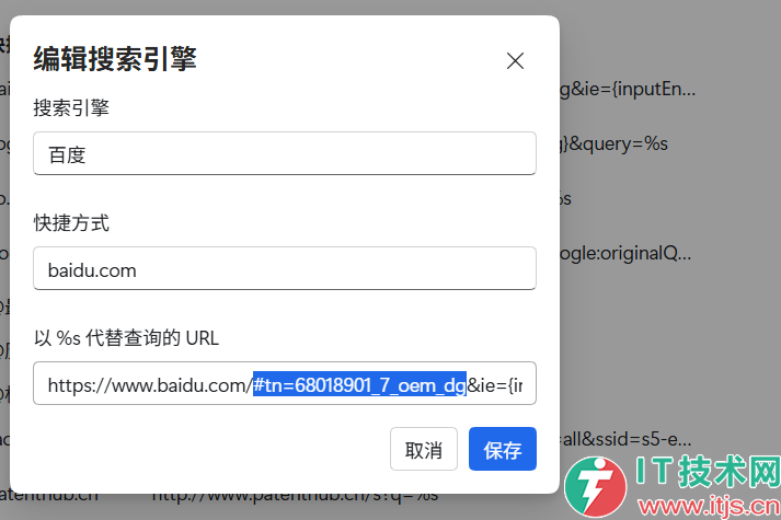 6、点击编辑百度的地址,如下图,删除蓝色部分。或者直接复制https://www.baidu.com/&ie={inputEncoding}&wd=%s这个地址替换原来的地址: